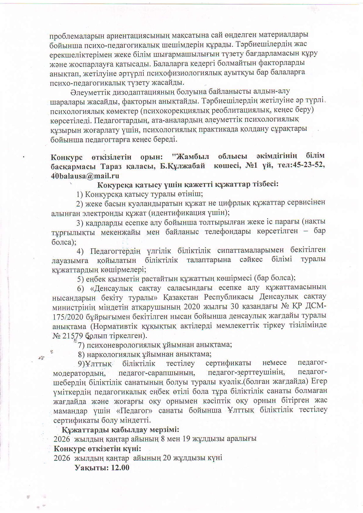 • Бос жұмыс орындары туралы хабарландырулар » №40 "Балауса" бөбекжай-бақшасы