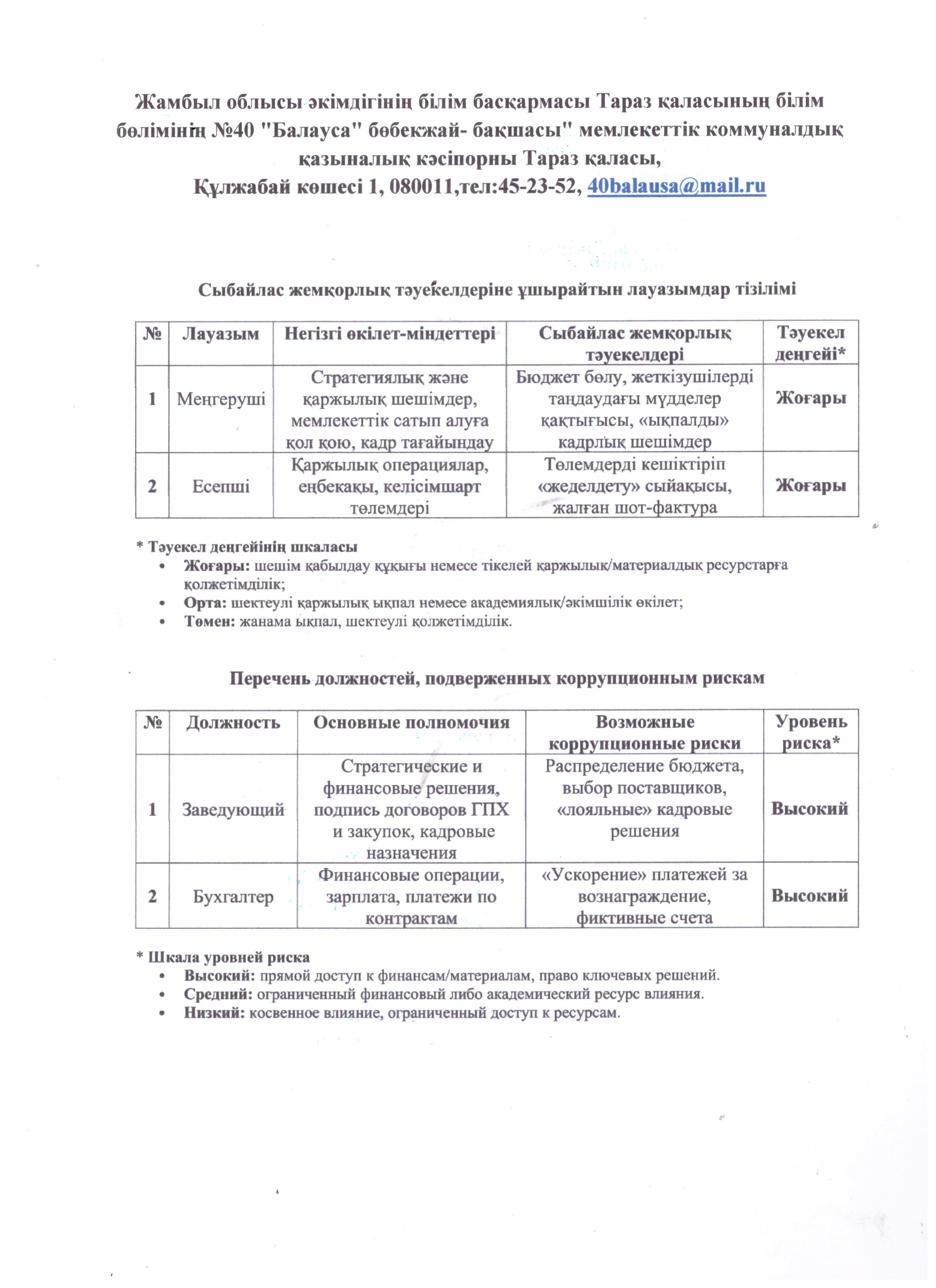 Сыбайлас жемқорлық тәуекелдеріне ұшырайтын лауазымдар тізілімі » №40 "Балауса" бөбекжай-бақшасы