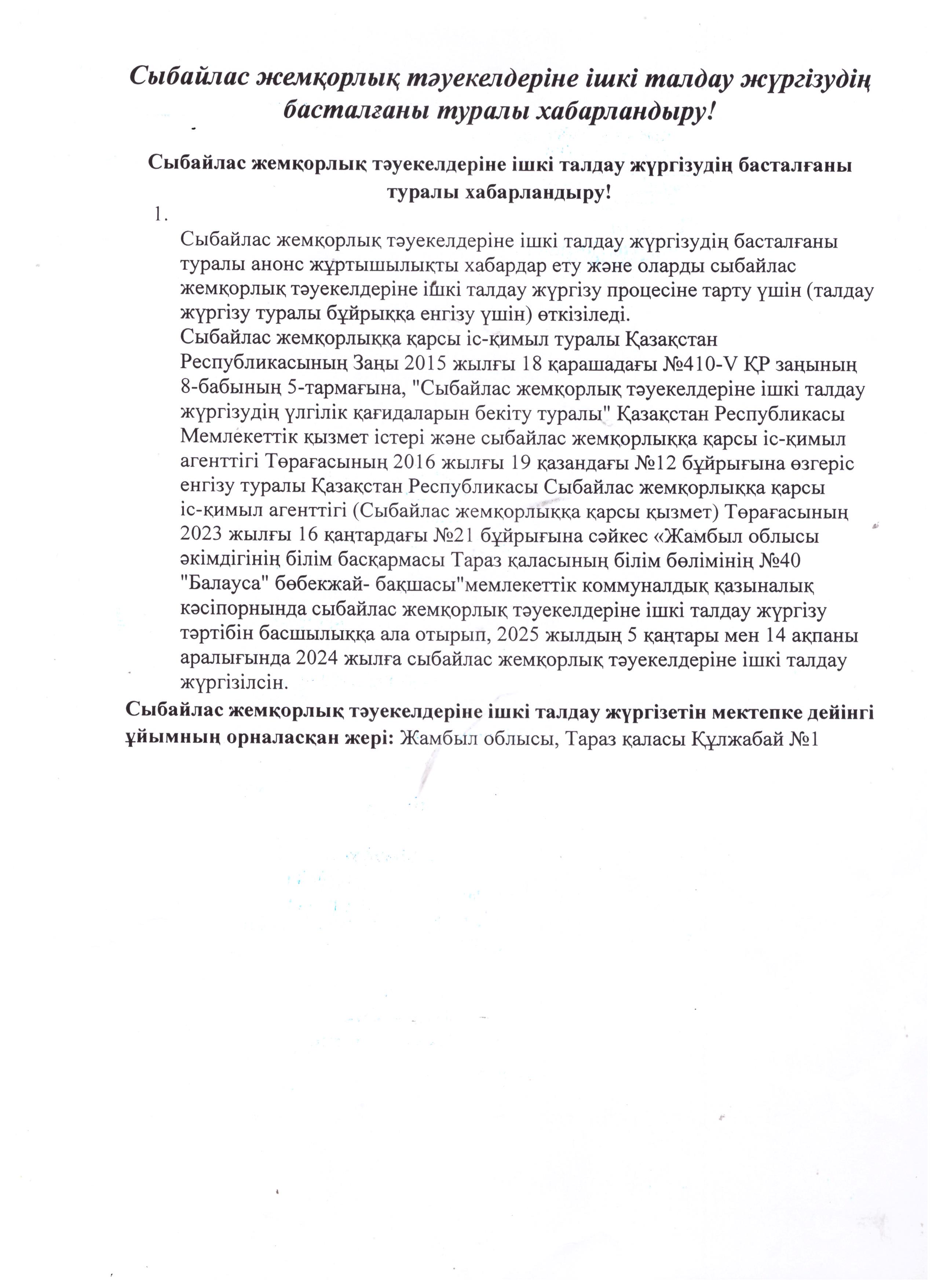 17 декабрь 2024 Сыбайлас жемқорлық тәуекелдеріне ішкі талдау жүргізудің басталғаны туралы хабарландыру! sybajlas-zhemorly-tuekelderne-shk-taldau-zhrgzud-bastalany-turaly-habarlandyru.pdf [592,86 Kb] (cкачиваний: 0) Посмотреть онлайн файл: sybajlas-zhemorly-tuekelderne-shk-taldau-zhrgzud-bastalany-turaly-habarlandyru.pdf