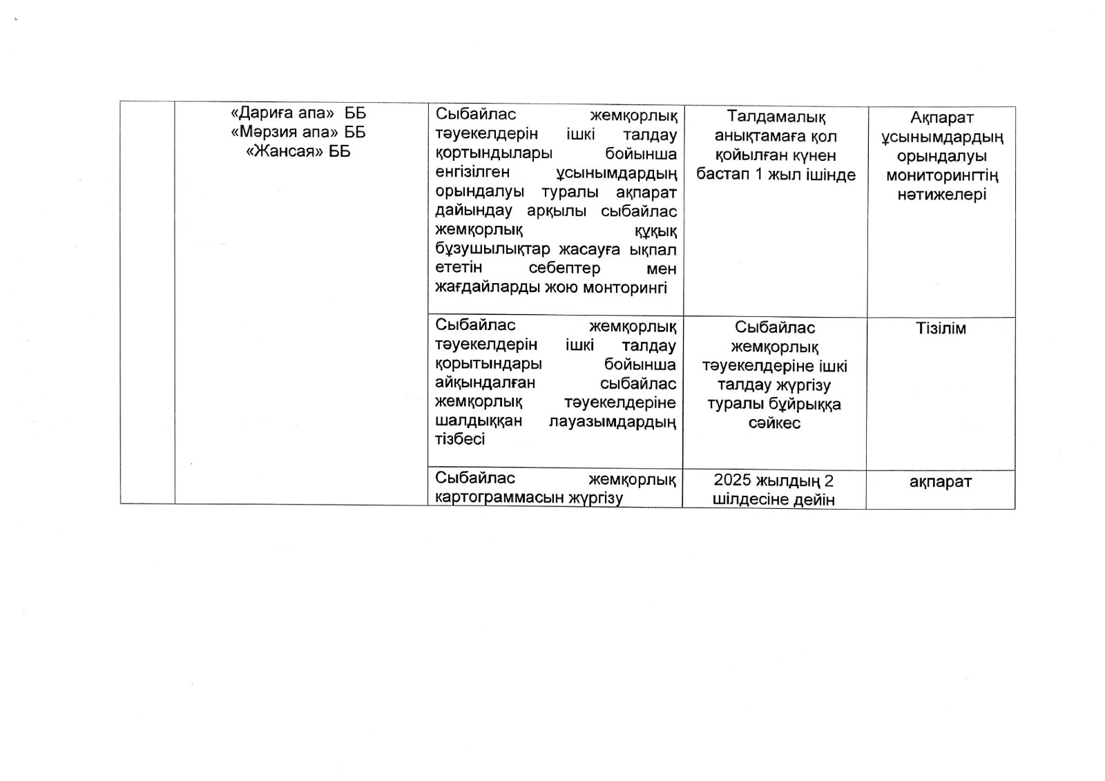 Сыбайлас жемқорлық тәуекелдеріне ішкі талдау жүргізу жөніндегі жұмыс жоспары » №40 "Балауса" бөбекжай-бақшасы