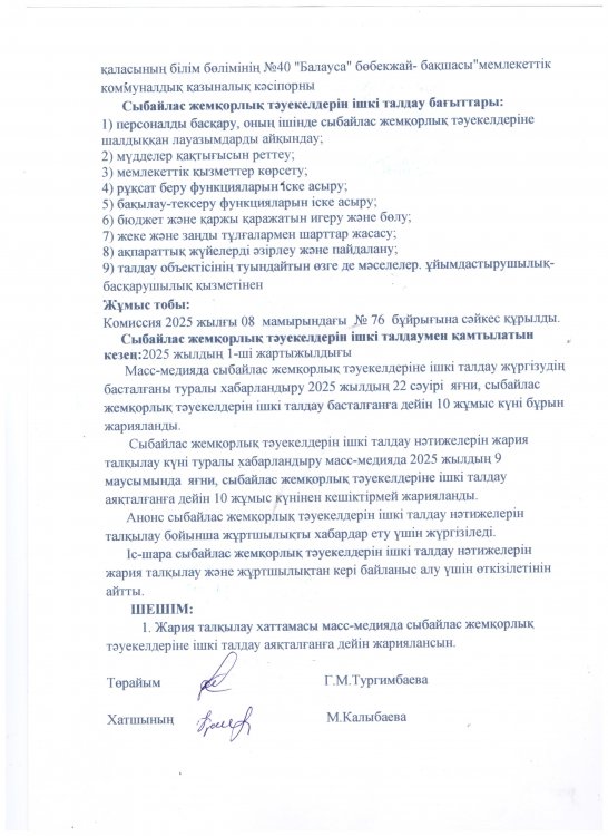 Сыбайлас жемқорлық тәуекелдерін ішкі талдау нәтижелерін жария талқылау ХАТТАМАСЫ » №40 "Балауса" бөбекжай-бақшасы